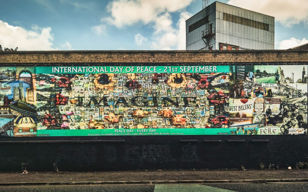 The two communities are no longer at war with one another, but Belfast is still a city divided into Protestant, Catholic and neutral territories by urban motorways, by ingrained mental maps and by peace walls. The visitor to Belfast’s Bombay Street – on the Catholic side of a grim peace wall which divides it from Cupar Way on the Protestant side – could be forgiven for thinking that here was the physical embodiment of an armistice, imposed from above on recalcitrant tribes.