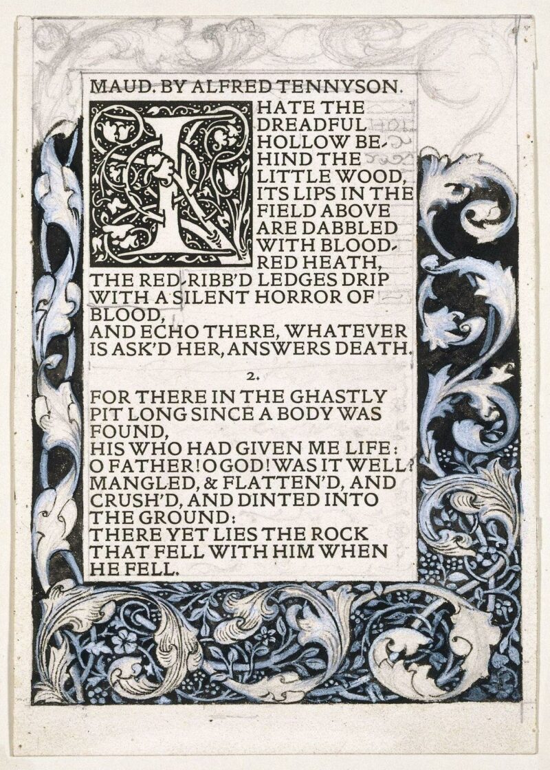 Main image credit: Proof of page layout for the front page of Maud by Alfred Lord Tennyson, unused, with hand-drawn border design and woodcut initial by William Morris, printed at the Kelmscott Press; London, 1893. © Victoria & Albert Museum
