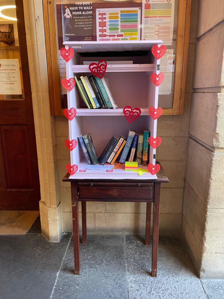 Decked out with love hearts and dressed in a brilliant shade of baby pink, the book swap case certainly made a statement outside Hertford’s Lodge. (“It’s so cute!”, as one passerby gushed as I walked past it at lunchtime!)